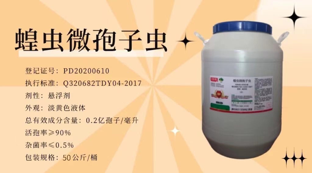 蝗蟲微孢子蟲:蝗蟲微孢子蟲(0.2 億孢子/毫升)。特點:胃毒性藥劑,活性高,安全環保,可提前預防,且只防治蝗蟲,人畜無害,不傷害天敵,持效期長蔓延殺蟲三代,死蟲率